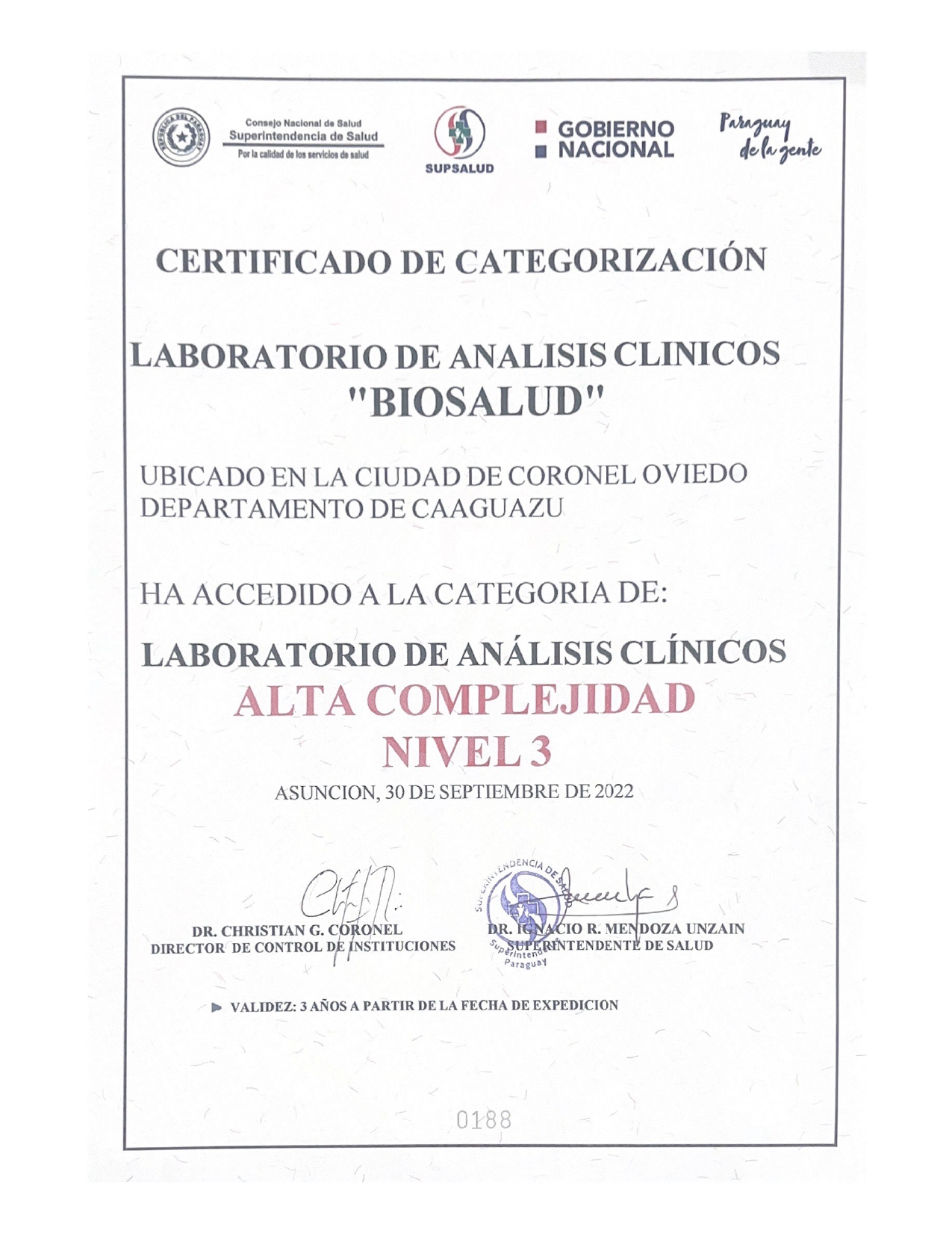Nuestros laboratorios se encuentran categorizados por la Superintendencia de Salud con la CATEGORÍA DE ALTA COMPLEJIDAD 3.